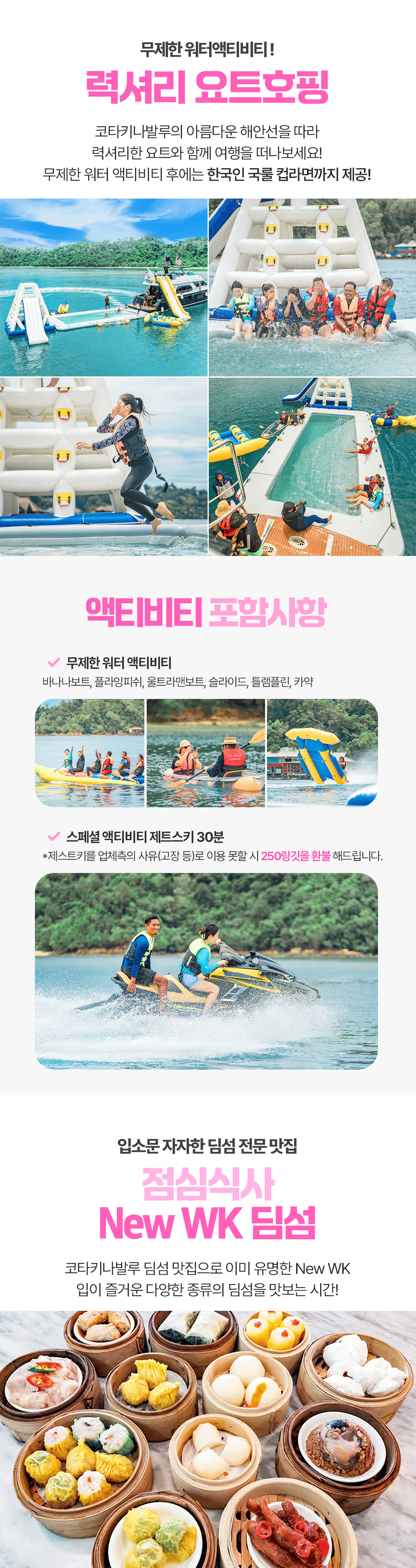 무료체험 스냅사진, 장비 및 입장료, 무제한 워터 액티비티(바나나보트, 플라잉피쉬, 울트라맨보트, 슬라이드, 트램플린, 카약, 제트스키), 컵라면